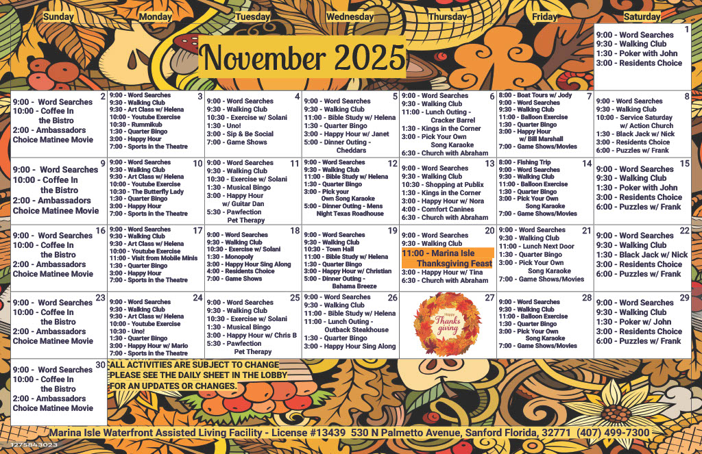At Marina Isle, there is always something going on. All of our residents and their families are welcome to suggest ideas and attend as many or as few activities as they like.