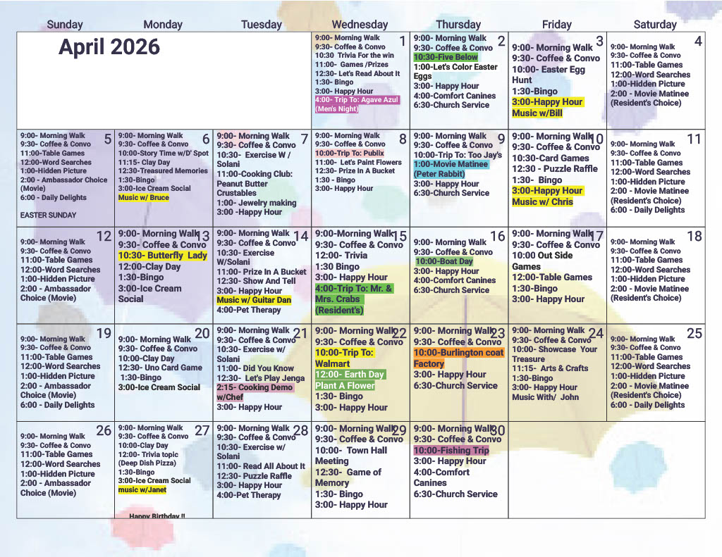 Take a look at all the Assisted Living Community Events we have lined up for this month below. Contact us if you have any questions.